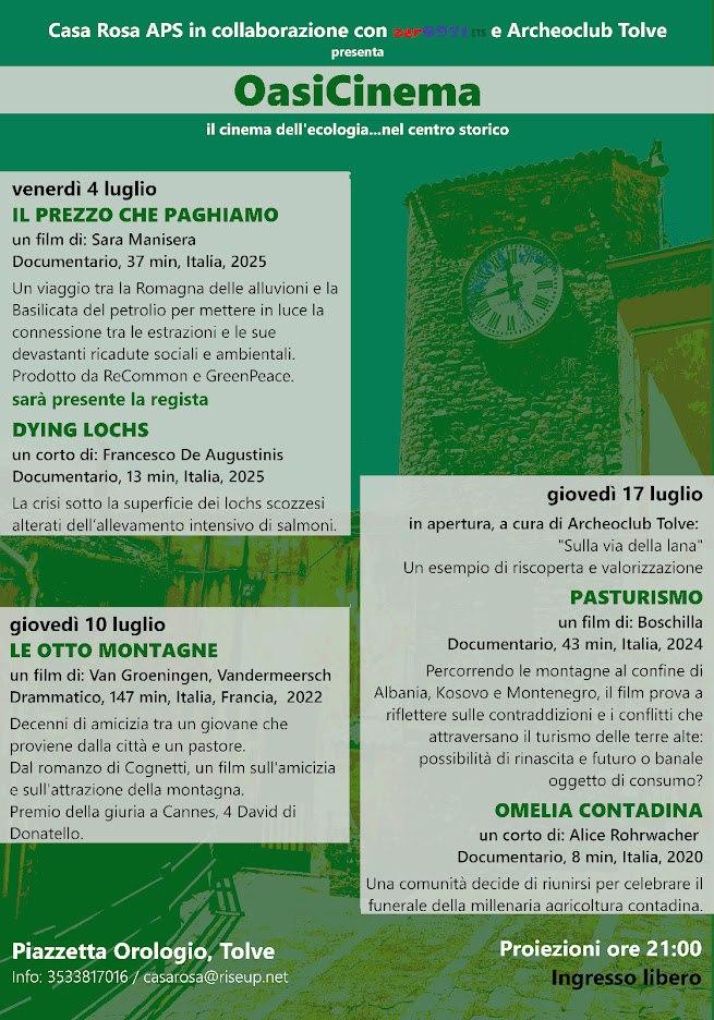 Anche quest’estate siamo tornati con la ormai tradizionale rassegna “OasiCinema – il cinema dell’ecologia”! quest’anno però abbiamo deciso di cambiare sfondo, ambientando la rassegna nel centro storico grazie alla collaborazione con Zer0971 ETS e archeoclubtulbium !
